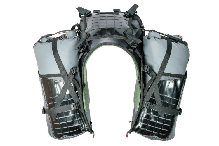 Очень легкое ~4кг, прочное, герметичное решение. Объем 25+25=50л + центральный полуклапан вмещает любой рюкзак/гермобаул/сумку объемом до 70л (комплектуется пользователем по своему усмотрению). Не требует наличия багажных боковых рамок, устанавливается на заднюю часть практически любого мотоцикла — сидушку/багажник/хвост/подрамник. Не боится интенсивных нагрузок, жесткой эксплуатации, грязи, воды. Хорошо переносит падения и не травмирует райдера. Обеспечивает снижение центра тяжести багажа и наилучшую развесовку, что отлично сказывается на управляемости мотоцикла. Подходит как для легких эндуро так и для тяжелых Adventure байков. Множество крепежных и утяжных строп позволяют качественно уложить любой груз, а свободные концы скручивающиеся под специальные резинки не будут болтаться на ветру. Хорошо совмещается с центральным кофром, подробнее в ВИДЕО